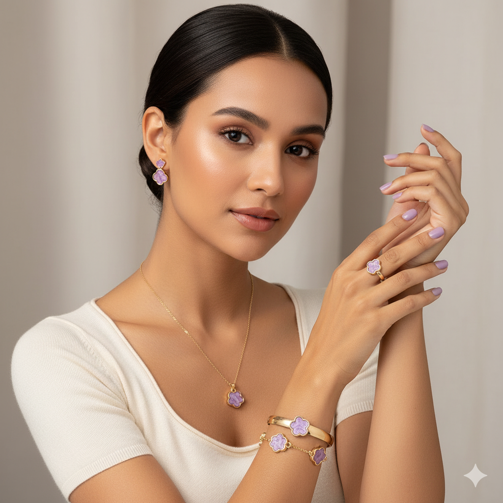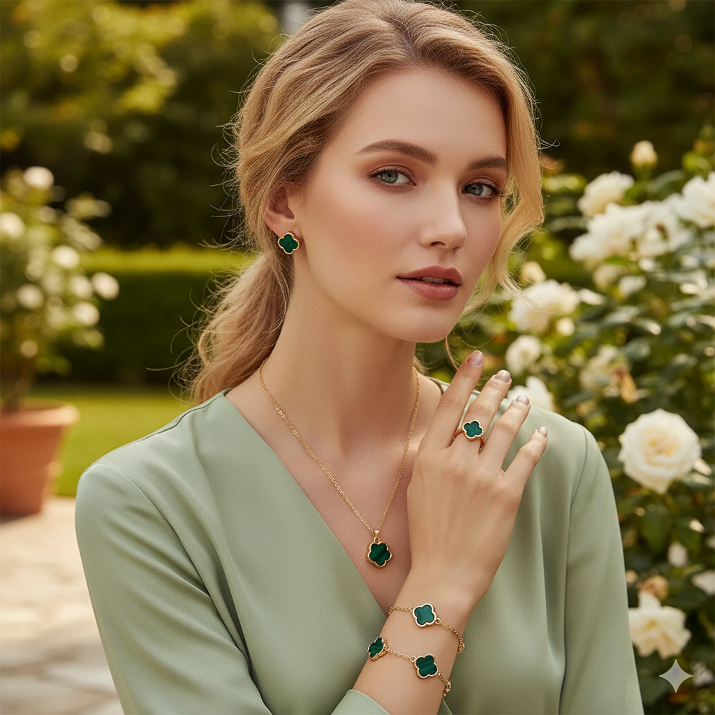 Luxe Clover - Pack de collar, brazalete, pulsera, pendientes y anillo